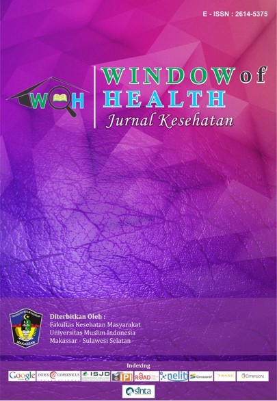 Window of Health: Jurnal Kesehatan is an open-access, peer-reviewed journal. The journal provides a platform for academics, researchers, and professionals to contribute high-quality research on health sciences. Focus and Scope of Window of Health: Jurnal Kesehatan is (Epidemiology, Health promotion and behavioral, Environmental Health, Occupational Health and Safety, Health Administration, Health Law and Policy, Hospital and Healthcare Management, Cost-Effectiveness Analysis in Public Health Interventions, Nutrition and dietetics, Reproductive Health), Medical, Nursing and Midwifery, Pharmacy, and Health Technology and Health Information Systems, and related fields. In addition, the Journal was first established in 2017 by the Institute of Study and Management Center, Journal of the Faculty of Public Health, University Muslim Indonesia, located in Makassar, South Sulawesi. Window of Health : Jurnal Kesehatan published on January, April, July and October with E-ISSN 2614-5375. This journal has also collaborated with Persatuan Sarjana Kesehatan Masyarakat Indonesia (PERSAKMI), Number: 03/KEP/PP-PERSAKMI/C/IX/2018, in terms of assisting the advancement of public health sciences and disseminating research results. Window Of Health: Journal Kesehatan has been nationally accredited and Ranked Second by the Ministry of Research, Technology, and Higher Education, Number: 200/M/KPT/2020, Regarding The scientific journals' Accreditation Ranking Of The Period 3 No 3/ 2020.