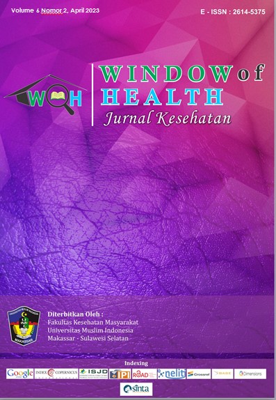 Window of Health: Jurnal Kesehatan is an open-access, peer-reviewed journal. The journal provides a platform for academics, researchers, and professionals to contribute high-quality research on health sciences. Focus and Scope of Window of Health: Jurnal Kesehatan is (Epidemiology, Health promotion and behavioral, Environmental Health, Occupational Health and Safety, Health Administration, Health Law and Policy, Hospital and Healthcare Management, Cost-Effectiveness Analysis in Public Health Interventions, Nutrition and dietetics, Reproductive Health), Medical, Nursing and Midwifery, Pharmacy, and Health Technology and Health Information Systems, and related fields. In addition, the Journal was first established in 2017 by the Institute of Study and Management Center, Journal of the Faculty of Public Health, University Muslim Indonesia, located in Makassar, South Sulawesi. Window of Health : Jurnal Kesehatan published on January, April, July and October with E-ISSN 2614-5375. This journal has also collaborated with Persatuan Sarjana Kesehatan Masyarakat Indonesia (PERSAKMI), Number: 03/KEP/PP-PERSAKMI/C/IX/2018, in terms of assisting the advancement of public health sciences and disseminating research results. Window Of Health: Journal Kesehatan has been nationally accredited and Ranked Second by the Ministry of Research, Technology, and Higher Education, Number: 200/M/KPT/2020, Regarding The scientific journals' Accreditation Ranking Of The Period 3 No 3/ 2020.